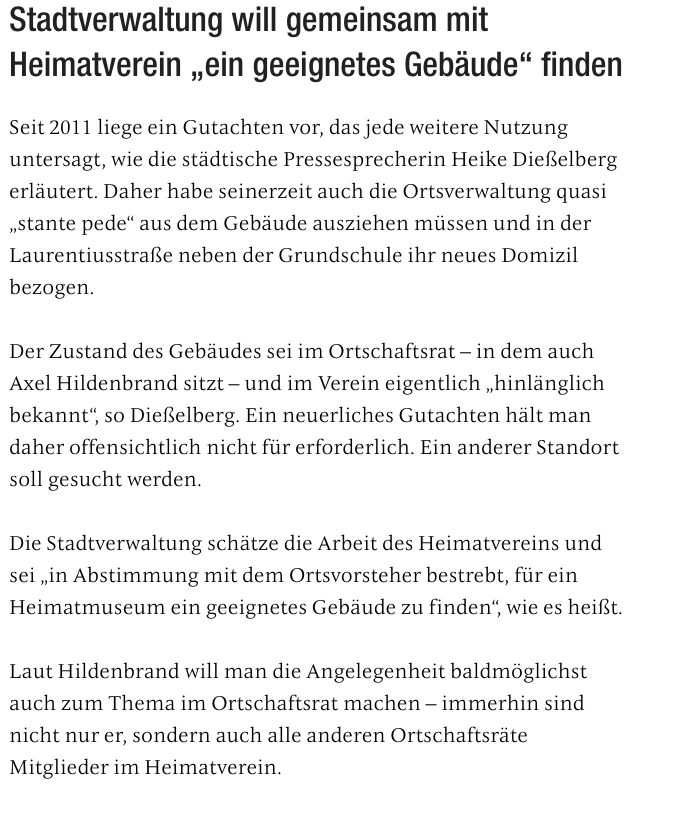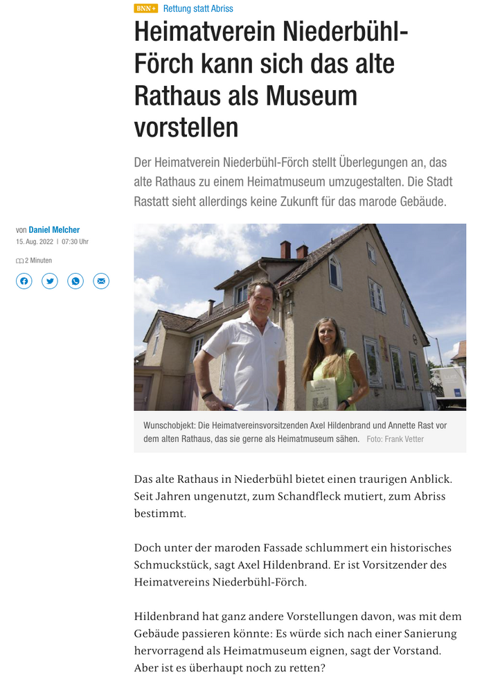 Rettung statt Abriss!Heimatverein Niederbühl-Förch16. Aug. 20221 Min. LesezeitAktualisiert: 24. Okt. 2024Mit NaN von 5 Sternen bewertet.Badische Neuste Nachrichten vom 15.08.2022 Heimatverein Niederbühl-Förch kann sich das alte Rathaus als Museum vorstellen.